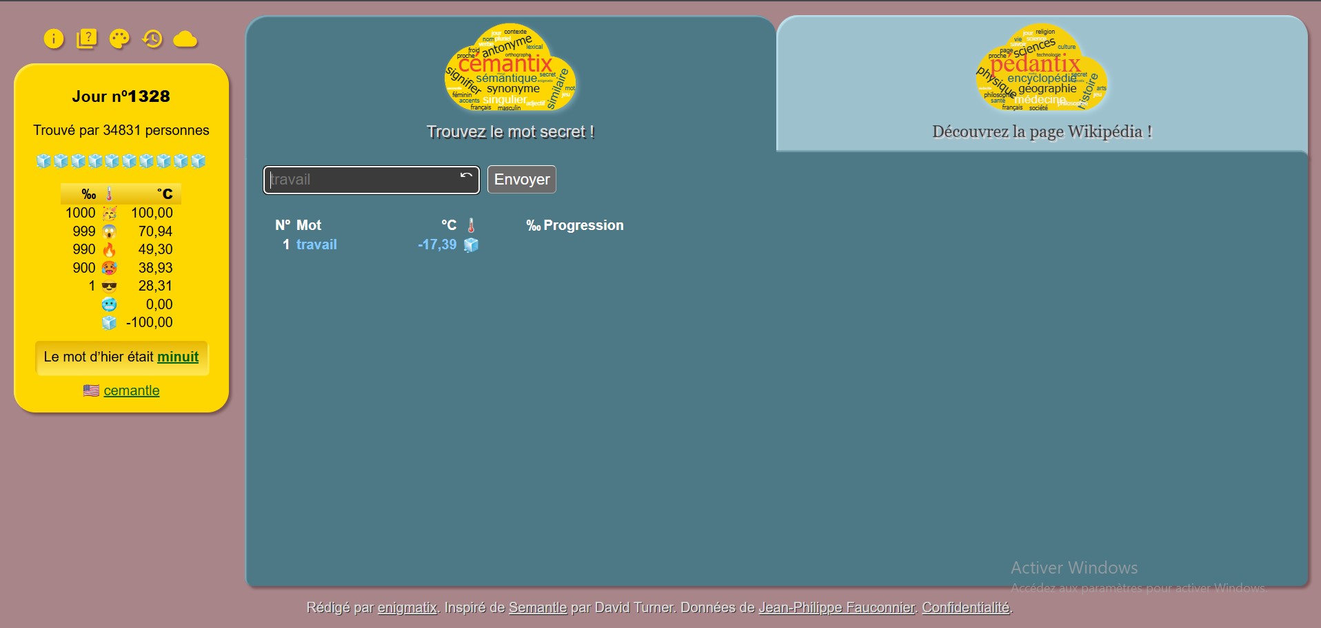 Cemantix repose sur une base de données linguistique spécifique. Certains mots rares, récents ou familiers peuvent ne pas y figurer.